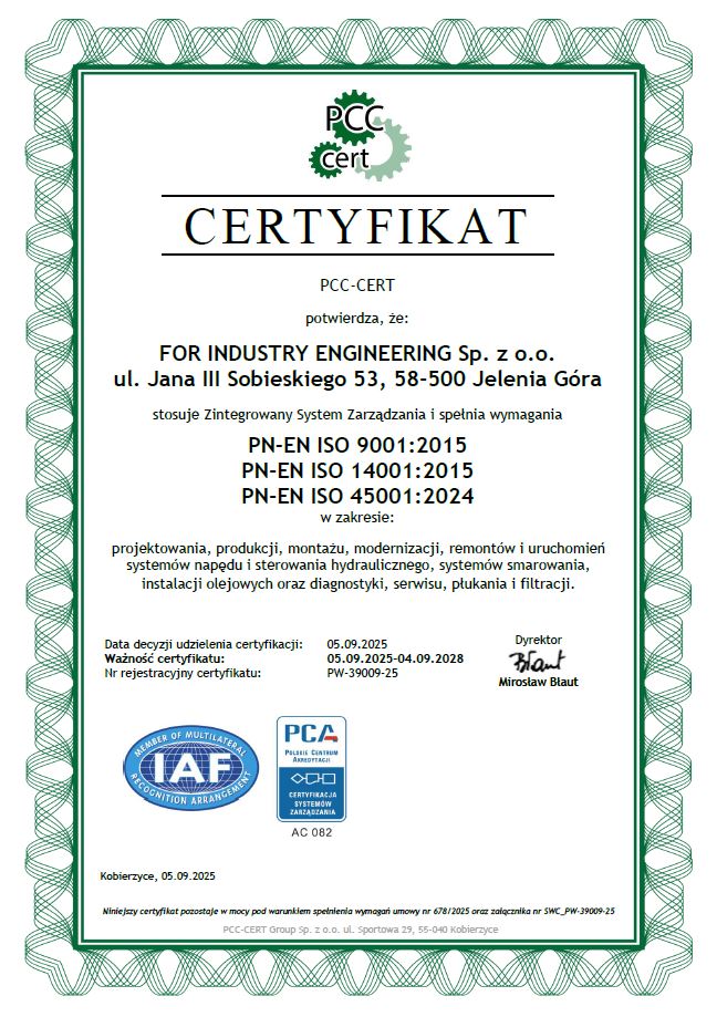 FOR INDUSTRY ENGINEERING dynamicznie się rozwija, realizując projekty na terenie 11 krajów Europy. Specjalizujemy się w hydraulice siłowej oraz instalacjach przemysłowych, oferując innowacyjne rozwiązania i usługi najwyższej jakości. Nasze zaangażowanie i profesjonalizm pozwoliły nam zyskać zaufanie klientów w całej Europie.